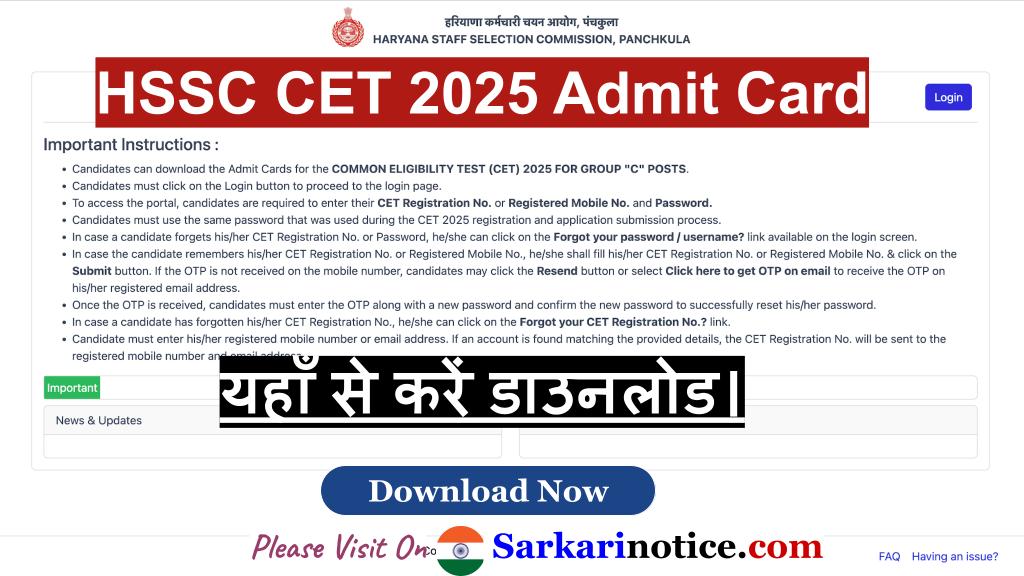 HSSC CET 2025 : The Haryana Staff Selection Commission (HSSC) has officially released the Admit Card for the Common Eligibility Test (CET) 2025 for Group-C posts under Advertisement No. 01/2025. This announcement is crucial for all aspirants who have successfully submitted their application forms for the exam.