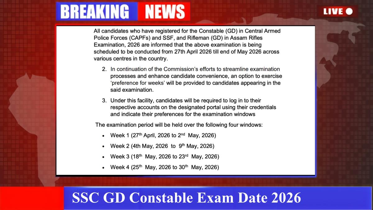 - SSC GD Exam Date: April 27 – May 30, 2026